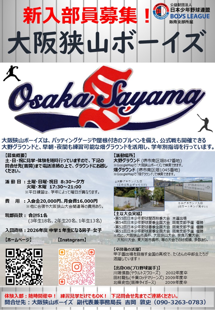 ※↓大阪狭山ボーイズ faceBooK、Instagram はこちらから