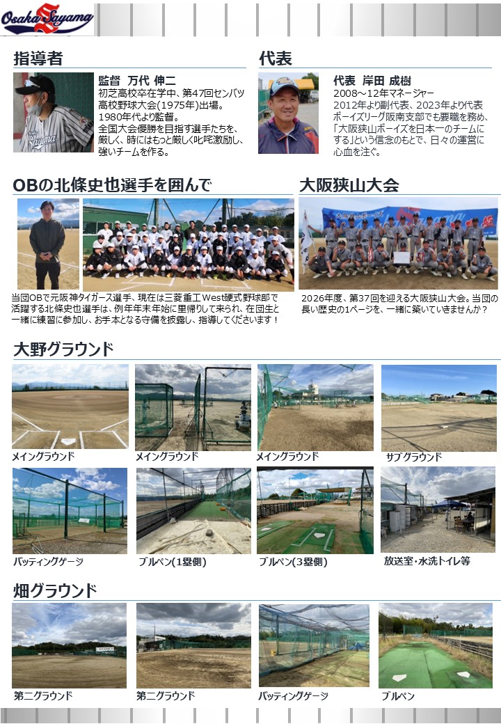 令和7年度 新1年生(47期生)の大阪狭山ボーイズへの体験入部・入団を希望する方は、土曜日・日曜日・祝祭日に随時行ってますので、ご気軽に電話連絡の上お越しください。